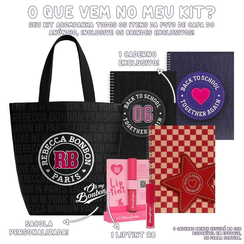 Com o Kit da Rebecca Bonbon (RB), você terá muito mais do que simples acessórios: terá companheiros que unem funcionalidade e design encantador. Conhecida por seu charme parisiense e estilo sofisticado, a RB traz neste kit o necessário para quem deseja se destacar com elegância e praticidade, seja na escola, faculdade ou no trabalho.